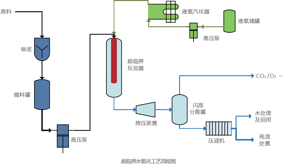 危险废物经预处理制备成具有流动性的浆态物质,利用高压原料泵将其压力升高到22.1MPa以上,原料与氧气同时进入反应器内进行超临界水氧化反应,危废中的污染物被分解,产物经初步降温后进入降压工序,在降压的过程中,通过闪蒸分离使物料温度降低到100℃以下,产物中的CO2 、O2等气体产物分离出来,固液产物经压滤处理后实现分离,水经进一步处理后可回用,残渣通过处置完成最终处理。